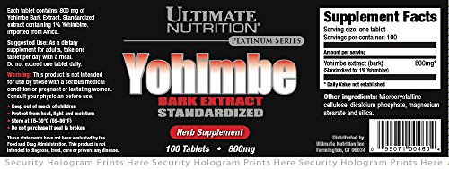 Specification: Ultimate Nutrition Yohimbe Bark Extract Tablets, Standardized, 800 mg, 100-Count Bottles