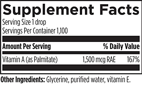 Powerful 5000 IU Per Drop – Just one drop of this unique liquid product provides a high potency 5000 IU of vitamin A as retinol palmitate (1500 mcg retinol activity equivalents, or RAE).